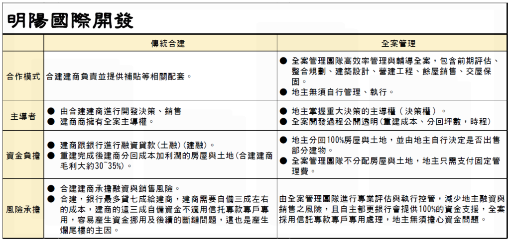 「全案管理」是地主委託專業管理團隊統籌執行全案重建過程的大小事務,並分回全部重建後面積,也就是未來重建後價值全部歸地主所有的方案。相較於「傳統合建」由建商主導,在「全案管理」的架構下,地主為全案資金提供者,故掌握重大事項的「決策權」,像是遴選建築師、選定信託與融資銀行、營造廠發包等等,都將透過明陽團隊提供專業協助,並依照地主決議來執行。明陽團隊在重建過程中扮演可靠的專業顧問角色,使得案件在確保品質下可以如期執行,成功重建。